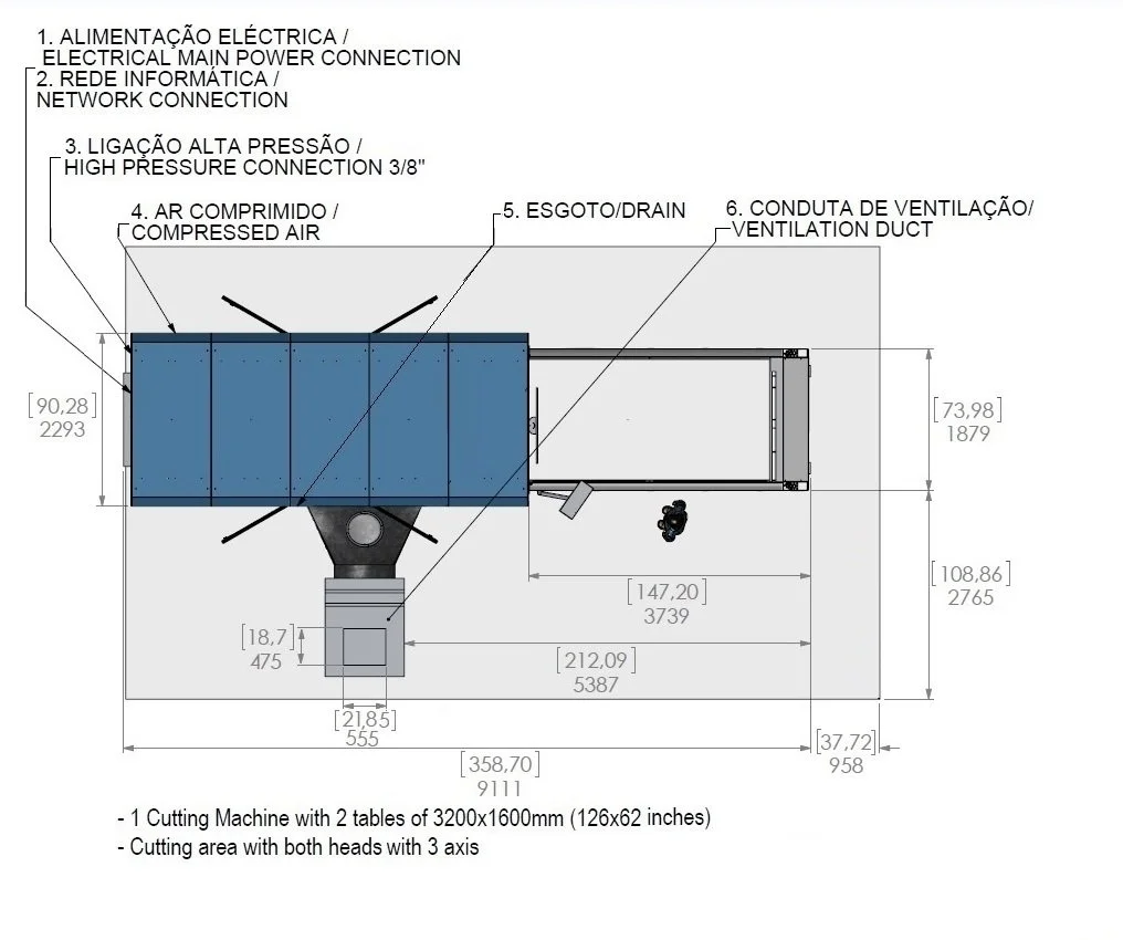 Table useful dimensions (mm): 3.200 x 1.600 / 2.000 x 1.600 / 3.000 x 3.000